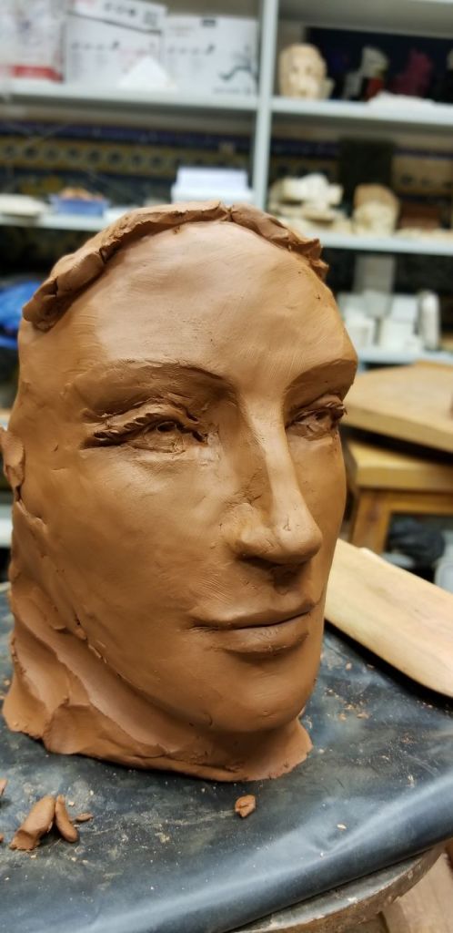 Cabeza femenina que empecé hace dos días en clase para mostrar a mis alumnos de 2.º de Revestimientos murales como puede hacerse. Va a ser parte de la ornamentación de una fachada